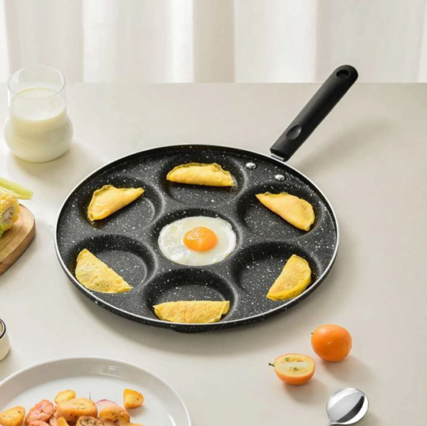 Una sart n de 7 hoyos con 7 huevos fritos es ideal para el desayuno familiar Tambi n se puede utilizar para hacer hamburguesas panqueques etc El interior no pegajoso facilita la limpieza despu s de cada uso Hecho de aluminio de alta calidad durable y calentado uniformemente Mango ergon mico agarre c modo